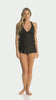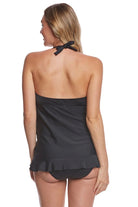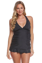 Traje de baño de maternidad tipo tankini con escote halter y delicado fruncido que se adapta al crecimiento del abdomen con suavidad. Su diseño brinda soporte, comodidad y estilo, perfecto para disfrutar el agua o relajarte bajo el sol con total confianza en cada etapa del embarazo.