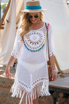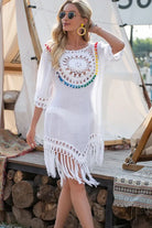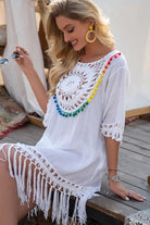Salida de baño fresca y ligera con detalle tejido en crochet al frente que resalta con aplicaciones de pompones de colores. Su diseño en tela fluida y con flecos en el borde aporta movimiento y un estilo bohemio ideal para tus días de playa o alberca. Perfecta para complementar tu traje de baño con un look divertido, cómodo y lleno de encanto.