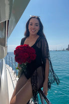 Kimono largo de encaje transparente con mangas acampanadas y cinturón ajustable. Su diseño elegante y sofisticado es ideal para llevar sobre el traje de baño, aportando un look femenino y con estilo en la playa o en la alberca.