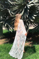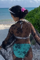 Kimono largo de encaje transparente con mangas largas y diseño floral. Su estilo ligero y sofisticado lo convierte en una prenda ideal para complementar el traje de baño, brindando un look elegante y femenino en la playa o la alberca.