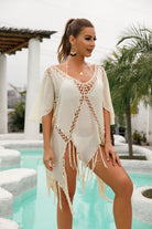 Salida de baño con diseño bohemio y detalles en tejido abierto que aportan un estilo fresco y relajado. Su silueta ligera con flecos en el borde lo convierte en la prenda ideal para complementar tu traje de baño y disfrutar de la playa o la alberca con comodidad y estilo.