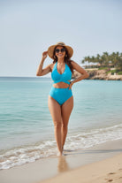 Traje de baño de dos piezas que ofrece una silueta favorecedora y un ajuste cómodo. Cuenta con control de abdomen integrado gracias a sus pliegues estratégicos y corte cruzado que estiliza visualmente la zona media. La parte inferior brinda cobertura y soporte con un corte alto que aporta comodidad y seguridad. Una opción perfecta para disfrutar de días de alberca o playa con estilo y confianza.