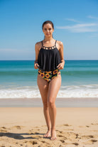 Bikini con top de tirantes y caída asimétrica que aporta movimiento y frescura. Su bottom de corte alto ofrece un ajuste cómodo y favorecedor, realzando la figura con un estilo moderno y femenino perfecto para disfrutar del sol con confianza.