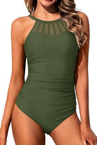 Traje de baño de una pieza con escote alto y detalle de transparencias en la parte frontal, que aporta un toque moderno y elegante. Su diseño con drapeado en el abdomen ayuda a estilizar la silueta, mientras que los tirantes ajustables en la espalda garantizan comodidad y soporte. Ideal para lucir segura y sofisticada en la playa o la alberca.