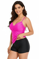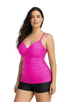 Diseño tipo tankini con escote cruzado que realza la forma natural y aporta un ajuste favorecedor. El top incorpora drapeados estratégicos para una silueta más definida, tirantes ajustables que brindan estabilidad y un fit cómodo en el torso. Se complementa con shorts suaves y prácticos, ideales para moverte con seguridad y libertad en cualquier actividad acuática.