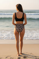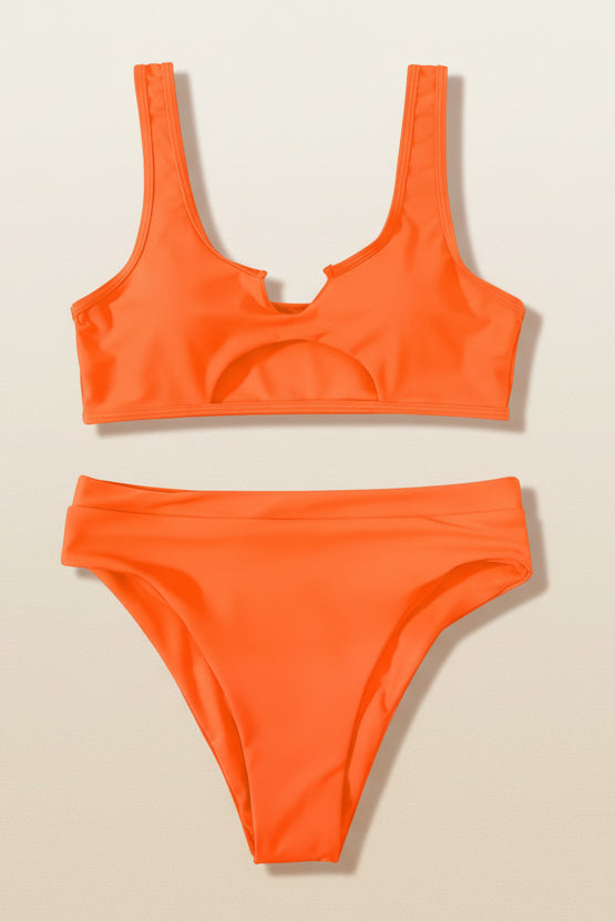 Traje de baño de dos piezas con diseño moderno y favorecedor. La parte superior cuenta con tirantes anchos que brindan mejor soporte y un escote con abertura sutil que realza la silueta de forma equilibrada. La parte inferior de tiro alto está pensada para estilizar la figura y ofrecer mayor comodidad al usarlo.