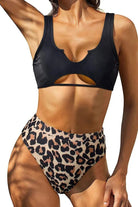 Top negro con diseño moderno de abertura inferior que aporta un toque atrevido y elegante. La parte inferior de tiro alto con estampado animal print en tonos beige y negro estiliza la figura y brinda un ajuste cómodo. Perfecto para destacar con un look sofisticado y audaz en la playa o la alberca.