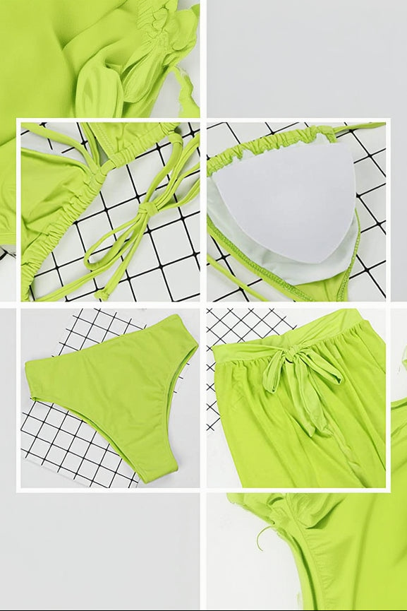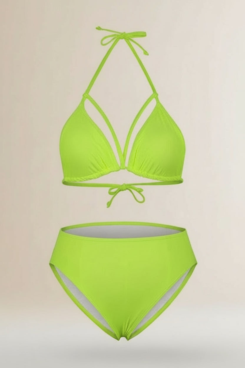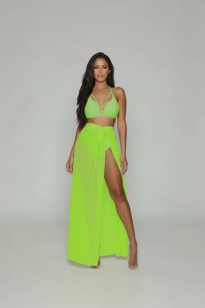 Traje de baño de 3 piezas con diseño de tirantes dobles en el top tipo triángulo y falda tipo pareo incluida. La parte inferior es de cintura alta para mayor comodidad y soporte, creando un look moderno y atractivo para la playa o la alberca.