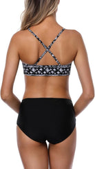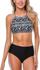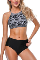 Traje de baño de dos piezas con estilo deportivo y moderno. El top de cuello alto presenta un estampado geométrico y tirantes que se cruzan en la espalda para mayor soporte y seguridad. La parte inferior de cintura alta en diseño liso complementa el conjunto ofreciendo comodidad y ajuste favorecedor.
