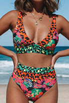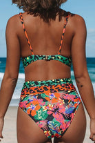 Traje de baño de dos piezas con estampado tropical y detalles de animal print que crean un contraste moderno y llamativo. El top de escote en V con tirantes ajustables ofrece un ajuste favorecedor, mientras que la parte inferior de cintura alta estiliza la silueta con un diseño vibrante y lleno de energía.