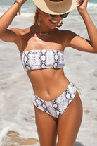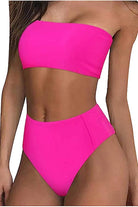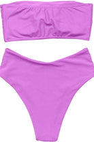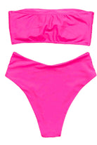 Traje de baño de dos piezas con top tipo bandeau sin tirantes que ofrece un estilo moderno y cómodo. La parte inferior de tiro alto estiliza la cintura y brinda soporte, creando una silueta favorecedora y elegante para lucir con confianza en la playa o la alberca.