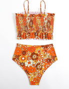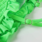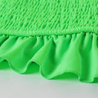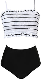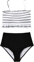 Traje de baño de dos piezas con top de tirantes delgados en diseño fruncido con volantes, que aporta un estilo delicado y femenino. La parte inferior de corte alto brinda contraste y elegancia, además de estilizar la silueta.