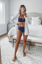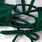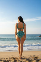 Traje de baño de dos piezas con top de tirantes anchos y amarre en la espalda, acompañado de un diseño con escote en “V” estructurado al frente. La parte inferior es de tiro alto con ajuste favorecedor que brinda comodidad y estilo.