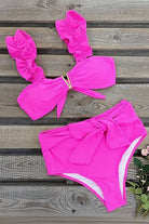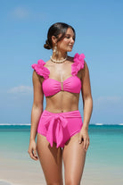 Traje de baño de dos piezas con diseño femenino y detalles que realzan la silueta. El top tipo bandeau cuenta con copas suaves, detalle central estructurado y tirantes con olanes que aportan un toque delicado y favorecedor. El amarre en la espalda permite ajustar el calce de forma personalizada, brindando comodidad y soporte ligero.