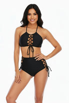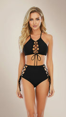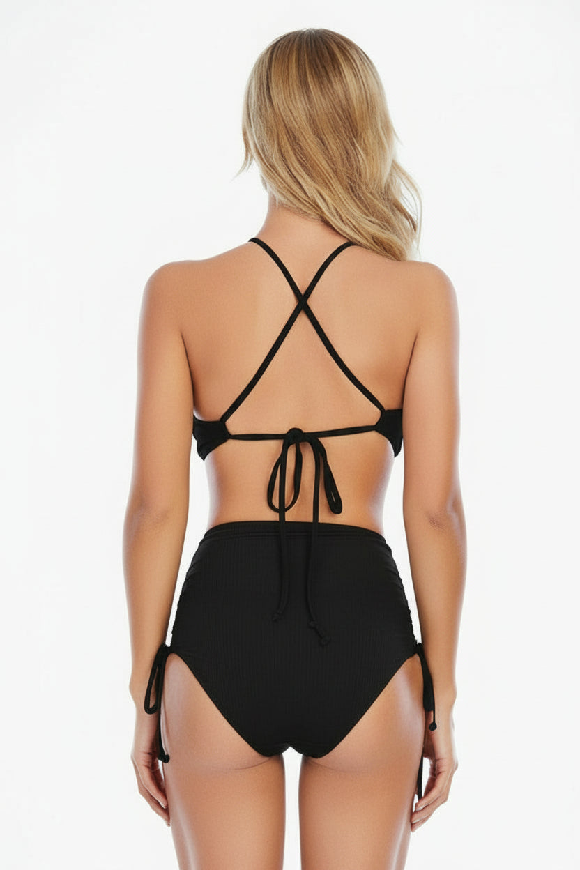 Traje de baño de dos piezas con top tipo halter y ajuste mediante cordones al frente, diseñado para ofrecer firmeza y un soporte adaptable. La parte inferior de talle alto incorpora laterales entrelazados que estilizan y aportan un acabado moderno. Ambos ajustes permiten personalizar la forma en que se sostiene y se moldea al cuerpo, brindando seguridad y comodidad.