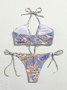 Bikini brasileño con estampado multicolor de estilo bohemio. El top con tiras al cuello y amarre al frente brinda ajuste y realce, mientras que la parte inferior de tiras laterales se adapta cómodamente a la silueta. Su diseño posterior tipo brasileño acentúa las curvas, ofreciendo un look moderno y vibrante perfecto para la playa o la alberca.