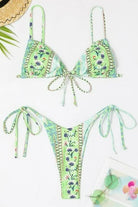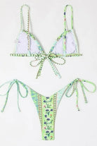 Este traje de baño de dos piezas destaca por su diseño ajustable y femenino. El top de triángulo con tiras finas permite adaptarlo perfectamente al cuerpo, brindando comodidad y soporte, mientras que la parte inferior con moños laterales resalta la figura con un toque coqueto. Ideal para disfrutar del sol y sentirte libre, fresca y segura en cada movimiento.