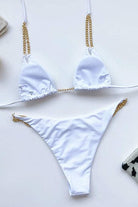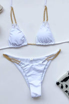 Traje de baño de dos piezas con cadenas doradas que aportan un toque elegante y moderno. Su top triangular con detalles metálicos brinda un ajuste favorecedor, mientras que el bottom con cadenas laterales resalta la silueta con un estilo sofisticado y atrevido. Perfecto para lucir un look distintivo y glamuroso en tus días de playa o piscina.