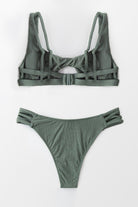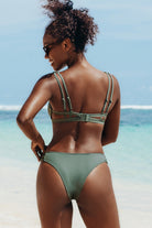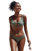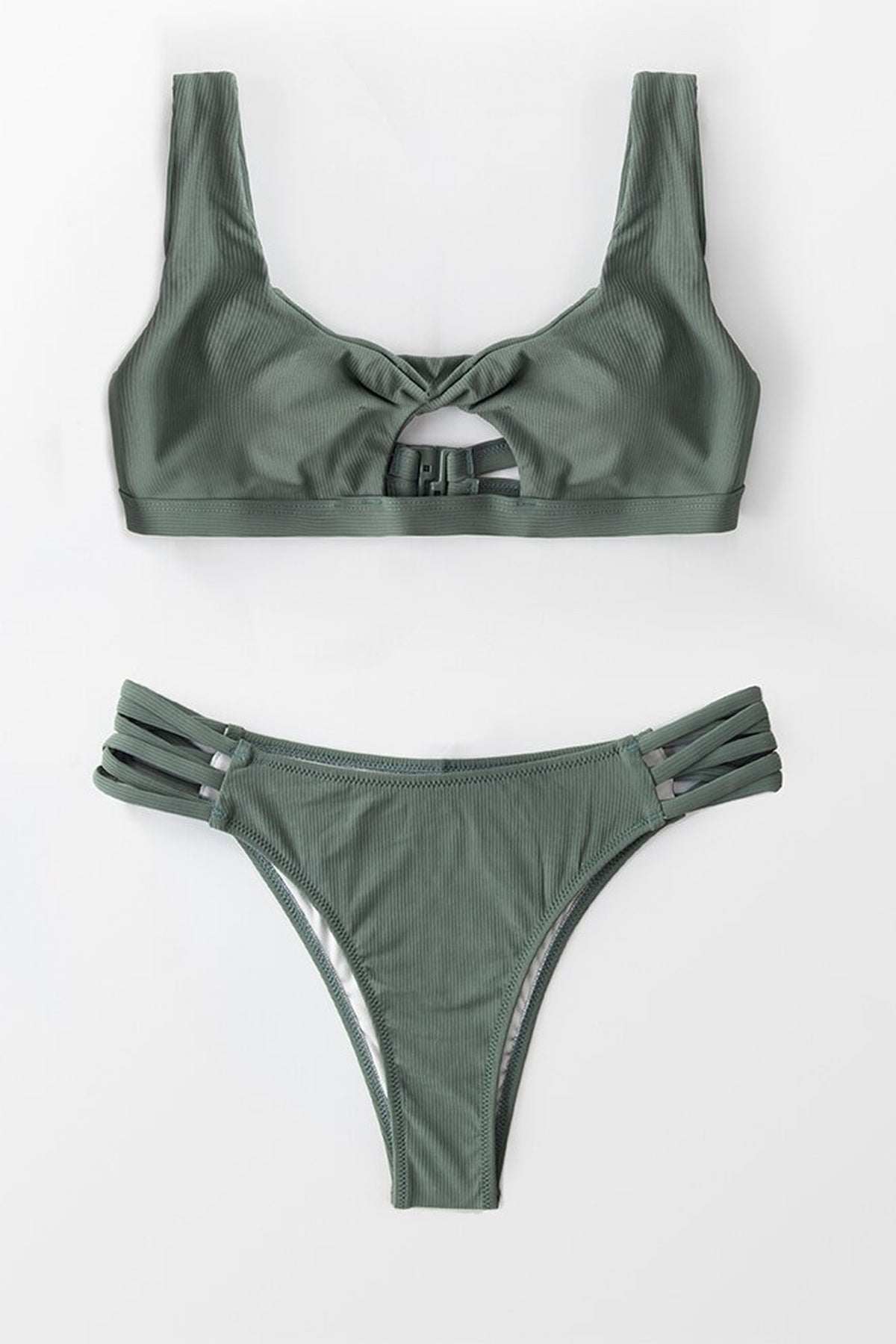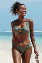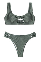 Bikini moderno de dos piezas con tirantes dobles ajustables y diseño con aberturas laterales que realzan la figura. Su top con nudo frontal aporta soporte y estilo, mientras que el bottom de corte medio ofrece un ajuste cómodo y favorecedor. Ideal para disfrutar la playa con elegancia y confianza.