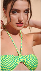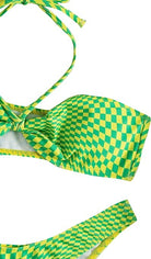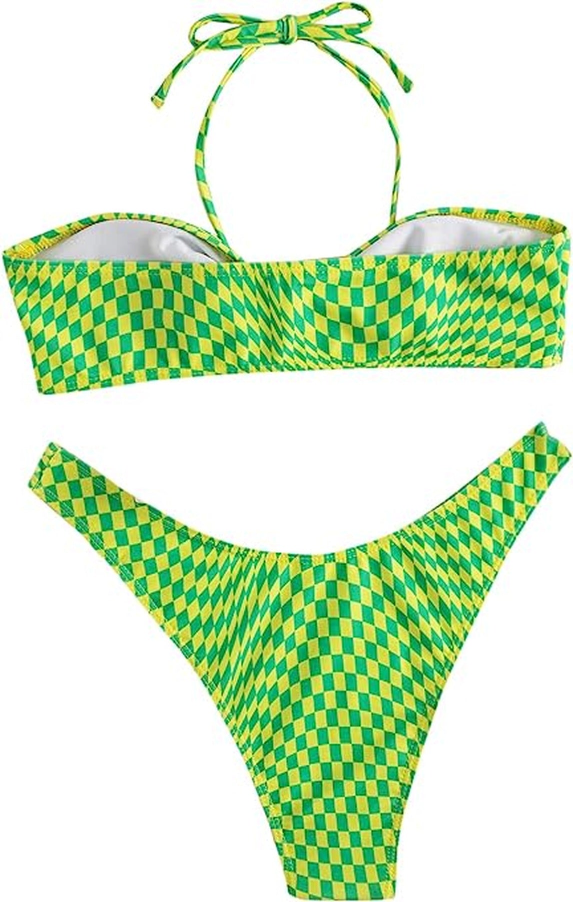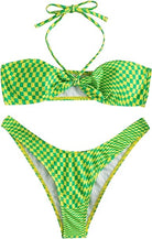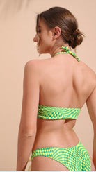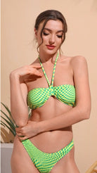 Traje de baño de dos piezas con diseño geométrico y estilo moderno. El top tipo bandeau con tiras al cuello ofrece soporte y realce natural, mientras que el bottom de corte alto estiliza la figura y aporta comodidad. Ideal para quienes buscan un look sofisticado y actual para disfrutar del sol y la playa