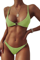 Traje de baño de dos piezas con top triangular ajustable y detalle de aro central. Su diseño minimalista resalta la figura de forma natural, ideal para disfrutar del sol con frescura, estilo y total libertad en cada movimiento.