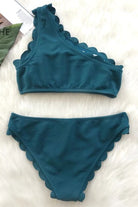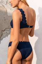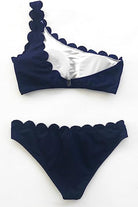 Traje de baño de dos piezas con diseño de tirante asimétrico que aporta un estilo moderno y elegante. El top cuenta con delicados bordes ondulados que realzan el escote de forma sutil y femenina, mientras que la parte inferior mantiene el mismo detalle para un look armonioso. Perfecto para quienes buscan un bikini cómodo, original y con un toque sofisticado para lucir en la playa o la alberca.