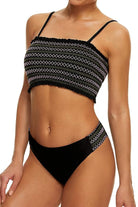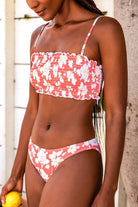 Bikini con top estilo bandeau fruncido que se ajusta cómodamente al cuerpo y realza la figura. Su diseño de tirantes delgados aporta soporte sin perder ligereza, mientras que la parte inferior clásica ofrece un equilibrio perfecto entre cobertura y estilo. Ideal para disfrutar del sol con un toque dulce y femenino.