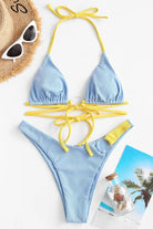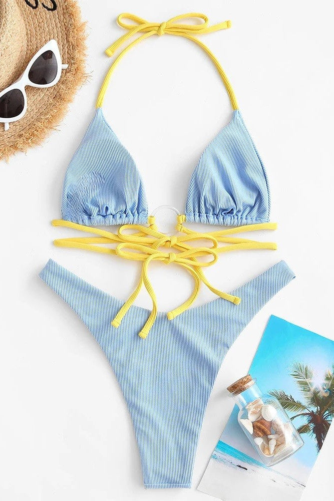 Bikini con diseño moderno y detalles en aros que realzan la figura. Su top de triángulo ajustable con tiras cruzadas ofrece un estilo audaz y favorecedor, mientras que la parte inferior de corte alto estiliza las piernas y acentúa la cintura. Perfecto para destacar con confianza en cada momento bajo el sol.