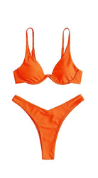 Este traje de baño de dos piezas combina un estilo moderno con un toque sofisticado. Su top con varilla y tirantes delgados brinda soporte y realce natural, mientras que la parte inferior de corte alto estiliza la figura y alarga visualmente las piernas. Ideal para disfrutar del sol con confianza y proyectar una elegancia relajada en cada movimiento.