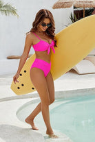 Traje de baño de dos piezas con diseño femenino y funcional. La parte superior presenta tirantes delgados ajustables y un nudo frontal que permite un ajuste personalizado, aportando soporte ligero y realce natural al busto. La parte inferior de tiro alto está diseñada para brindar mayor cobertura y una sensación cómoda que acompaña la silueta de forma favorecedora.