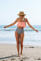 Traje de baño de dos piezas estilo tankini con blusa de vuelos y bottom de cintura alta. La blusa ofrece un ajuste cómodo y femenino con tirantes delgados y caída ligera que favorece el pecho y aporta movimiento. El bottom alto brinda cobertura y soporte, creando una silueta equilibrada y favorecedora. Una opción fresca y estilizada para disfrutar la playa o la alberca con comodidad y seguridad en cada movimiento.