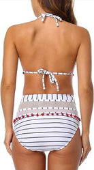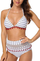 Traje de baño de dos piezas con borlas decorativas en color contrastante. El top de tirantes delgados y amarre al cuello brinda soporte ligero y un estilo moderno. La parte inferior de cintura alta incluye una franja de malla que aporta un toque fresco y original, combinando comodidad y diseño atractivo.
