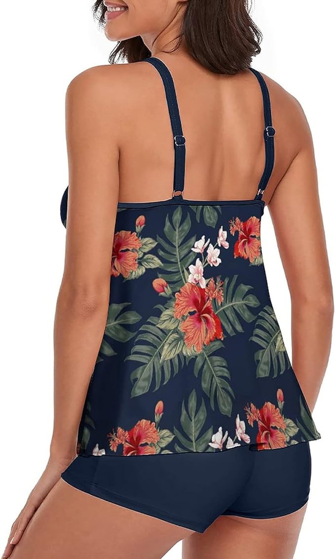 Traje de baño tipo tankini con short en color azul marino y blusa estampada con flores tropicales en tonos rojos, verdes y blancos. Su diseño de tirantes delgados y corte fluido en la parte superior brinda frescura, comodidad y un estilo moderno.
