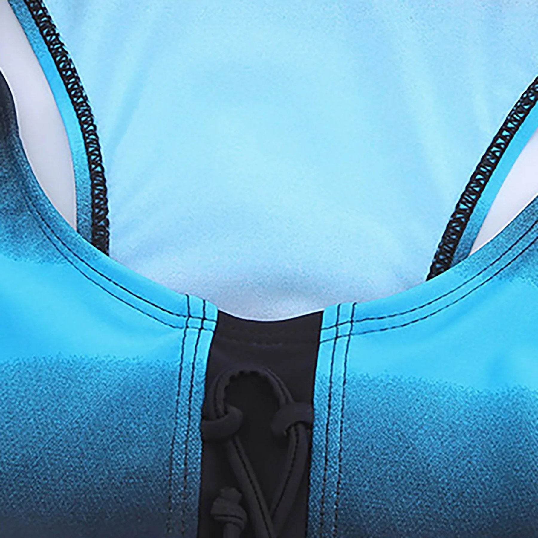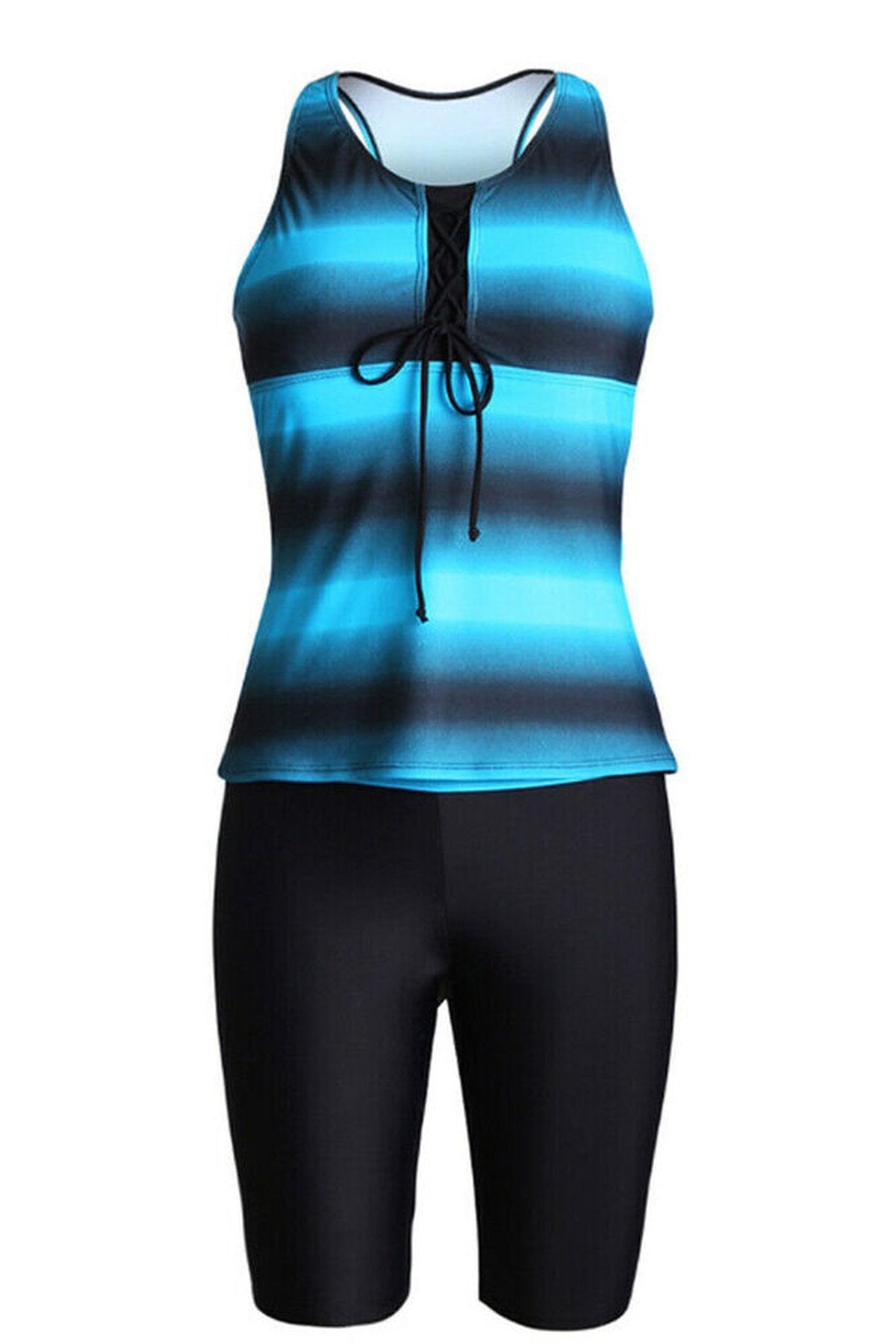Traje de baño tipo tankini con short largo en color negro y blusa en tonos azul degradado con franjas horizontales. Su diseño incluye un detalle de cordón en el escote que aporta un estilo moderno y favorecedor. El corte del short brinda mayor cobertura y comodidad, ideal para quienes prefieren seguridad y libertad de movimiento.