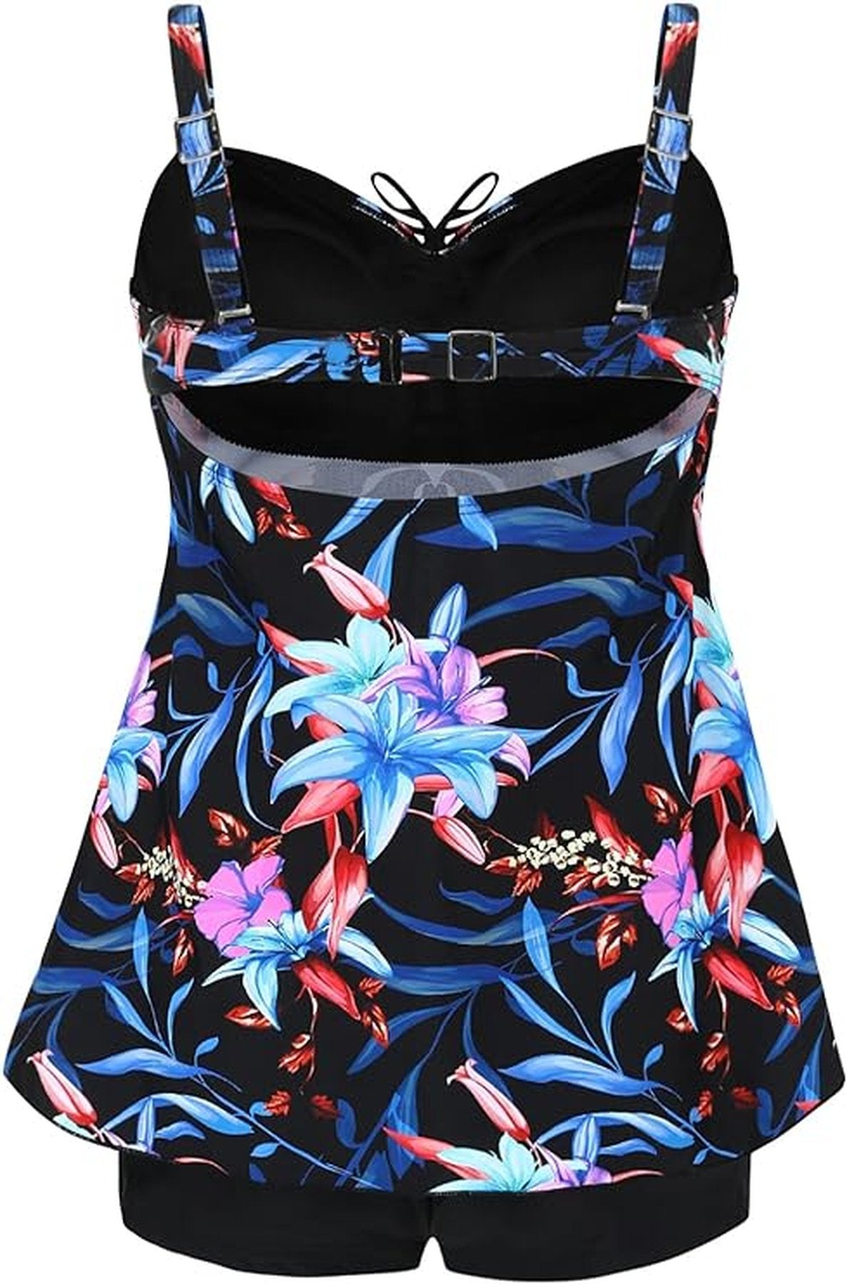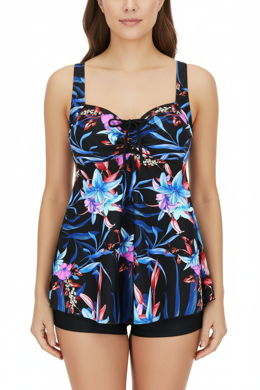 Traje de baño tipo tankini con short negro y blusa de tirantes estampada en flores multicolor sobre fondo negro. Su diseño con escote en forma de corazón y ajuste en el busto aporta un estilo femenino y favorecedor, mientras que el corte amplio de la blusa ofrece comodidad y libertad de movimiento.