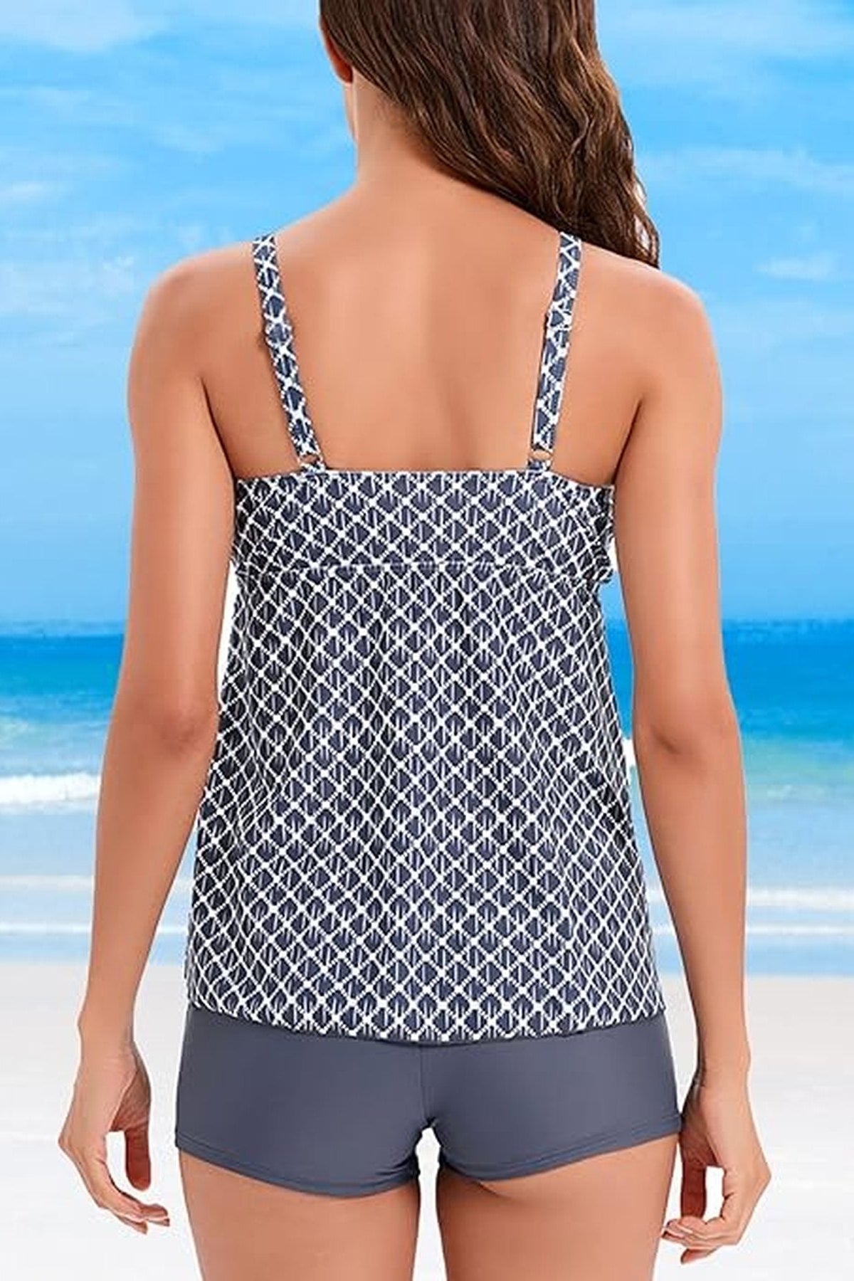 Traje de baño tipo tankini con short. Elegante estampado geométrico en blanco con fondo gris y un detalle de lazo al frente que aporta un estilo femenino y favorecedor. El corte de tirantes delgados y caída ligera brinda comodidad y libertad de movimiento.