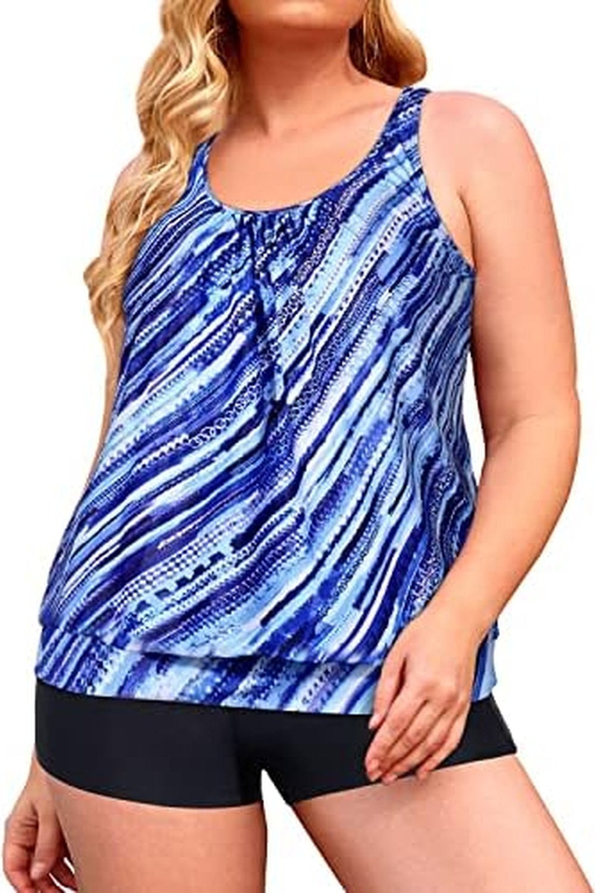 Traje de baño tipo tankini con short negro y blusa estampada en tonos azules con diseño de líneas diagonales. Su estilo moderno y fresco brinda un efecto visual estilizado, mientras que el corte suelto de la blusa ofrece comodidad y libertad de movimiento.