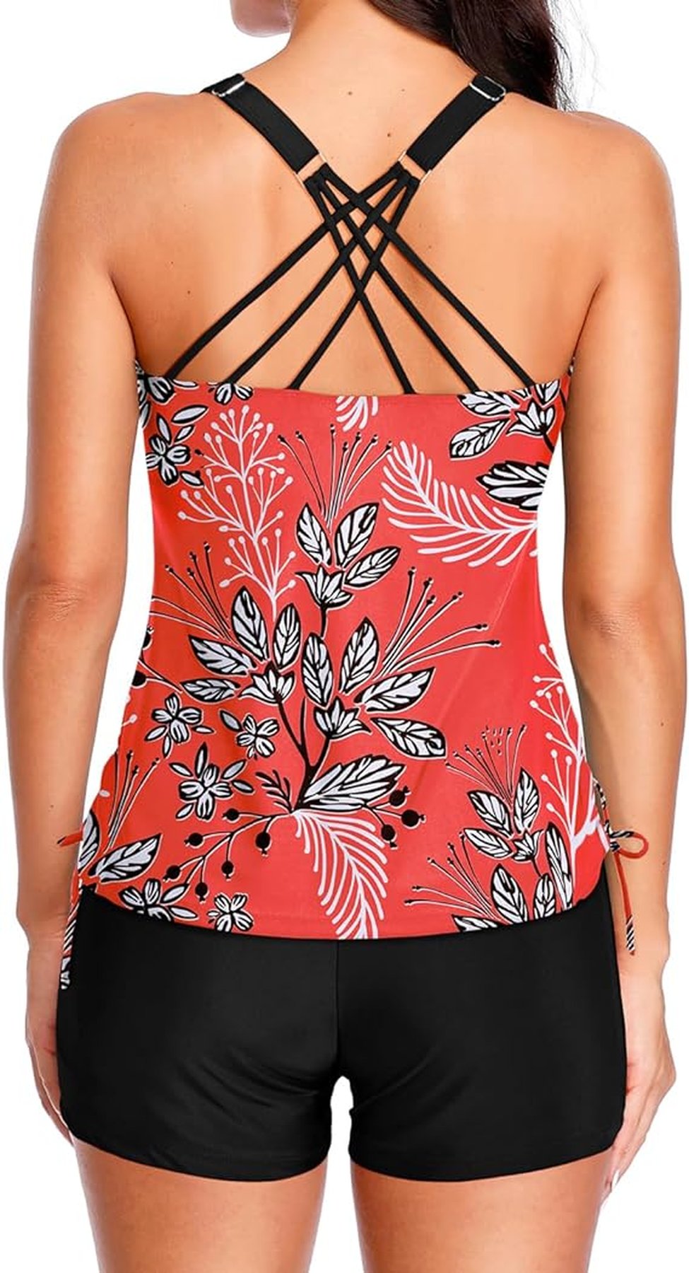 Un diseño que combina frescura y estilo. La parte superior presenta un estampado floral en tonos rojo y blanco, con tirantes cruzados ajustables en la espalda que brindan soporte y un toque moderno. El short negro aporta comodidad y seguridad para que disfrutes cada momento en la playa o la alberca.