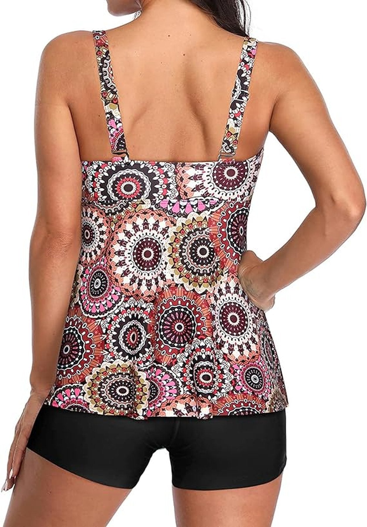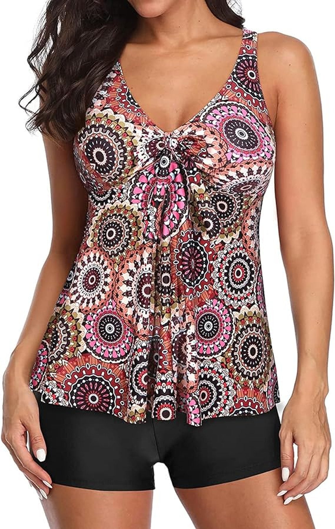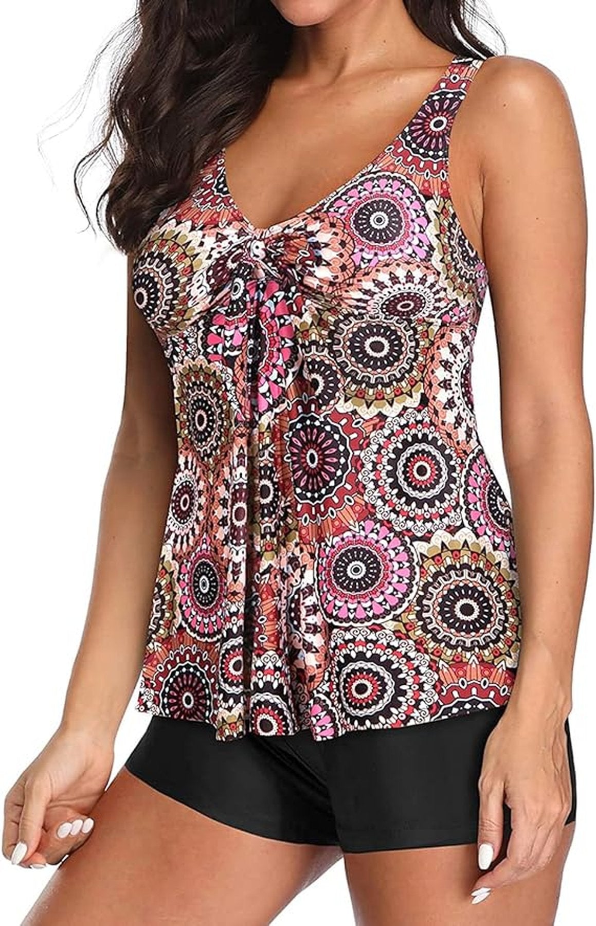 Traje de baño estilo tankini con un diseño moderno y llamativo. La parte superior cuenta con estampado mandala multicolor en tonos rosas, naranjas y marrones, además de un detalle de lazo al frente que realza la figura. El short en color negro sólido brinda comodidad, cobertura y seguridad para moverte libremente.