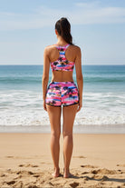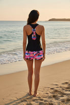 Traje de baño tipo tankini short de tres piezas, diseñado para brindar comodidad, soporte y libertad de movimiento. El top deportivo ofrece un ajuste seguro que acompaña el cuerpo sin oprimir, mientras que el short proporciona cobertura cómoda y funcional, ideal para actividades en playa o alberca. Su diseño favorece una silueta equilibrada y permite sentirse segura tanto dentro como fuera del agua. Es una opción práctica para quienes buscan un traje de baño versátil, cómodo y con un estilo relajado que se adapta a distintos momentos del día.