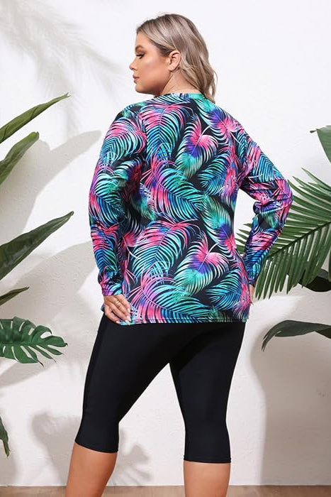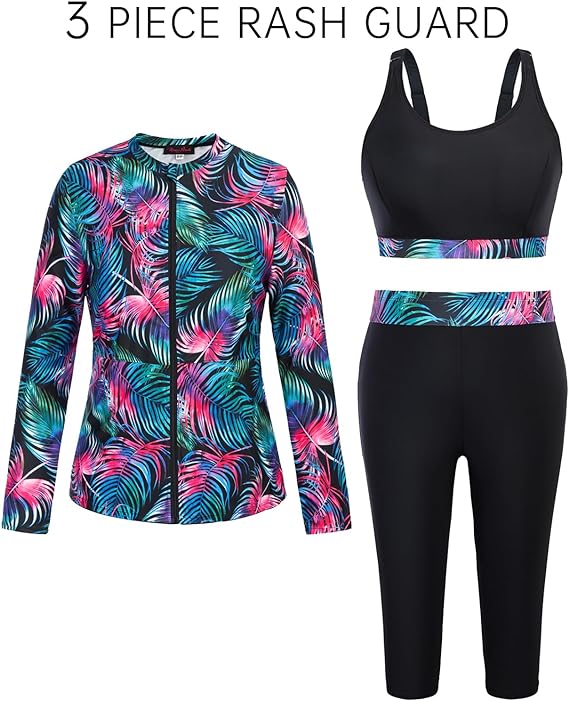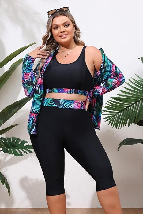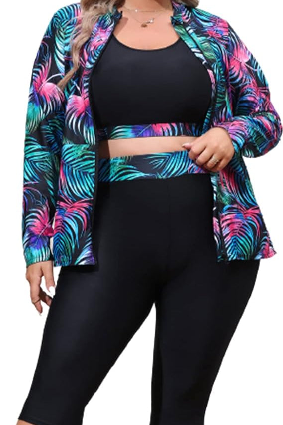 Este conjunto incluye top, short largo y chaqueta con estampado de hojas en tonos vibrantes. Su diseño ofrece cobertura, comodidad y soporte, ideal para nadar, practicar deportes acuáticos o disfrutar de un día activo bajo el sol. El tejido es suave, de secado rápido y con elasticidad que se adapta perfectamente a tu figura, brindando seguridad y estilo en cada movimiento.