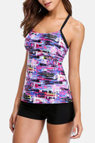Tankini de 2 piezas con diseño deportivo y moderno. Su blusa de tirantes delgados y espalda tipo racer ofrece soporte y libertad de movimiento, mientras que el short complementa con comodidad y cobertura ideal. Perfecto para nadar, ejercitarte o disfrutar un día relajado en la playa.