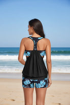 Traje de baño de dos piezas tipo tankini con short, diseñado para ofrecer comodidad, soporte y un ajuste favorecedor. La parte superior presenta un corte suelto con caída ligera que permite libertad de movimiento y ayuda a estilizar visualmente el abdomen sin ajustar. Su diseño con espalda tipo racer brinda mayor estabilidad y soporte, manteniendo el top en su lugar durante el uso, además de aportar un look deportivo y moderno. El short complementa el conjunto proporcionando cobertura y seguridad, ideal para disfrutar del agua o actividades fuera de ella con total confianza. Es un traje de baño funcional y versátil, pensado para acompañar la silueta de forma natural y cómoda.