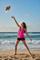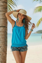 Traje de baño de dos piezas tipo tankini con short diseñado para brindar comodidad, soporte y una silueta visualmente estilizada. El top tipo tankini cuenta con un corte suelto y caída fluida que no se ajusta al abdomen, ofreciendo una sensación de ligereza y libertad al usarlo. Su escote redondeado aporta un ajuste cómodo y favorecedor, mientras que la base interior brinda soporte al busto sin rigidez. La espalda incorpora tirantes múltiples con diseño tipo arnés que aportan estabilidad y un detalle moderno, manteniendo el top en su lugar durante todo el día. Las jaretas laterales permiten ajustar el largo y personalizar el fit según tu preferencia. El short complementa el conjunto con un diseño práctico que se adapta suavemente al cuerpo, ideal para moverte con seguridad dentro y fuera del agua. Es un traje de baño pensado para quienes buscan sentirse cómodas, seguras y con un toque vibrante y actual.