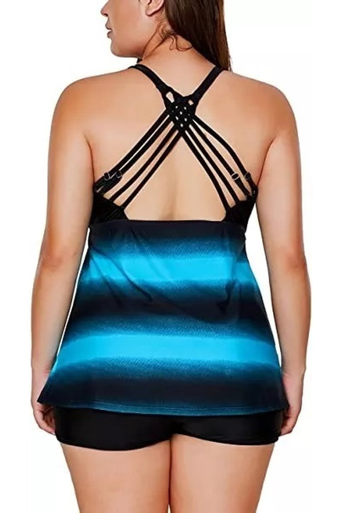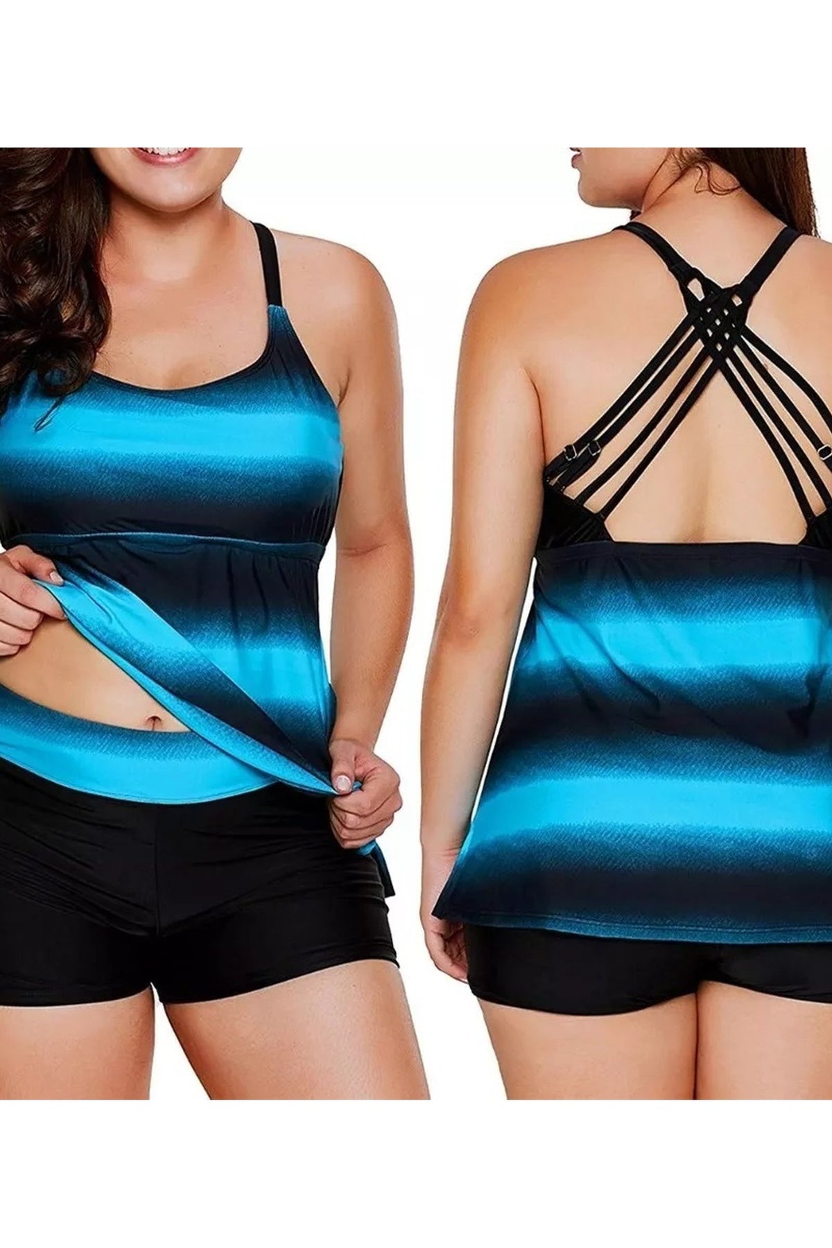 Este tankini short combina elegancia y comodidad con copas extraíbles suaves y acolchadas, que brindan un soporte delicado. Su escote en U y tirantes fijos ajustables ofrecen un ajuste personalizado y un estilo refinado. Disponible en un diseño sólido y degradado en tonos azul y negro, presenta una espalda regular que asegura comodidad y libertad de movimiento. Ideal para quienes buscan un look sofisticado y práctico en la playa o la piscina.
