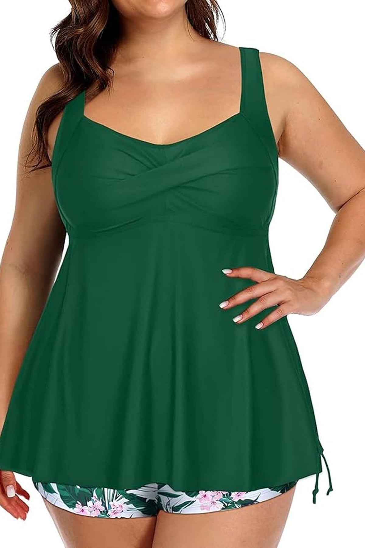 Disfruta del verano con este traje de baño tipo blusa tankini con short en un vibrante verde floral. Perfecto para quienes buscan comodidad sin sacrificar estilo, su diseño fresco y divertido realza tu figura mientras te permite moverte libremente. Ideal para días llenos de sol y diversión en la playa o la piscina. ¡Atrévete a lucir radiante y cómoda al mismo tiempo!