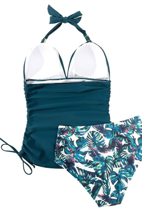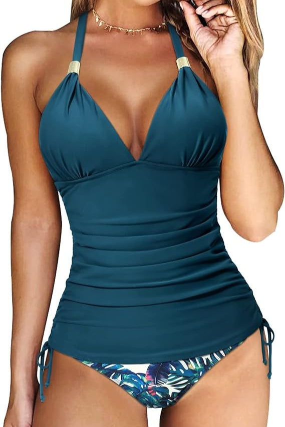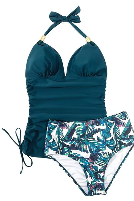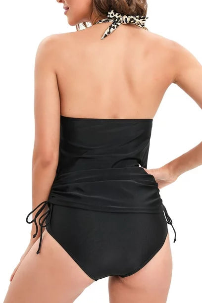 Tankini con diseño elegante que brinda soporte y confort en cada movimiento. Su parte superior con escote halter realza la figura, mientras que los drapeados laterales aportan un efecto estilizador. Incluye parte inferior de corte clásico con excelente ajuste. Una opción ideal para quienes buscan cobertura y estilo sin renunciar a la feminidad.