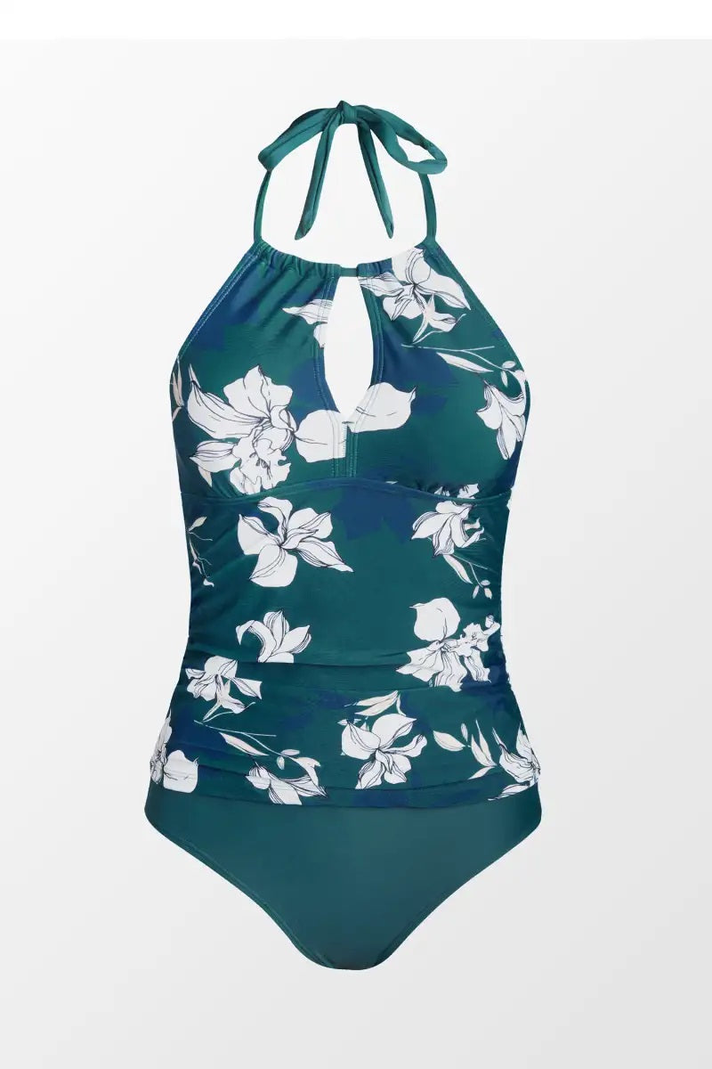 Traje de baño estilo tankini con escote halter ajustable que brinda soporte cómodo y favorecedor. La blusa incorpora control de abdomen que ayuda a estilizar la zona del torso con un ajuste firme pero cómodo, manteniendo una silueta equilibrada. El bottom acompaña con un calce suave y seguro que permite libertad de movimiento. Una opción diseñada para ofrecer comodidad, estilo y una figura armoniosa en cada uso.