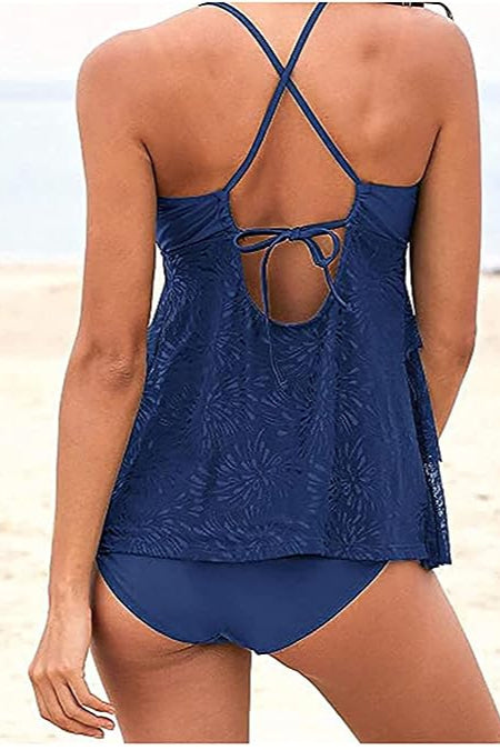 Traje de baño de dos piezas con tankini de tirantes delgados cruzados en la espalda. Su diseño de olanes en capas aporta movimiento y estilo, además de ayudar a disimular visualmente el abdomen. La parte superior cuenta con detalle de tiras cruzadas en el escote que le dan un toque moderno y femenino. Incluye parte inferior tipo brief para mayor comodidad y ajuste. Ideal para quienes buscan un balance entre estilo y seguridad en la playa o la alberca.