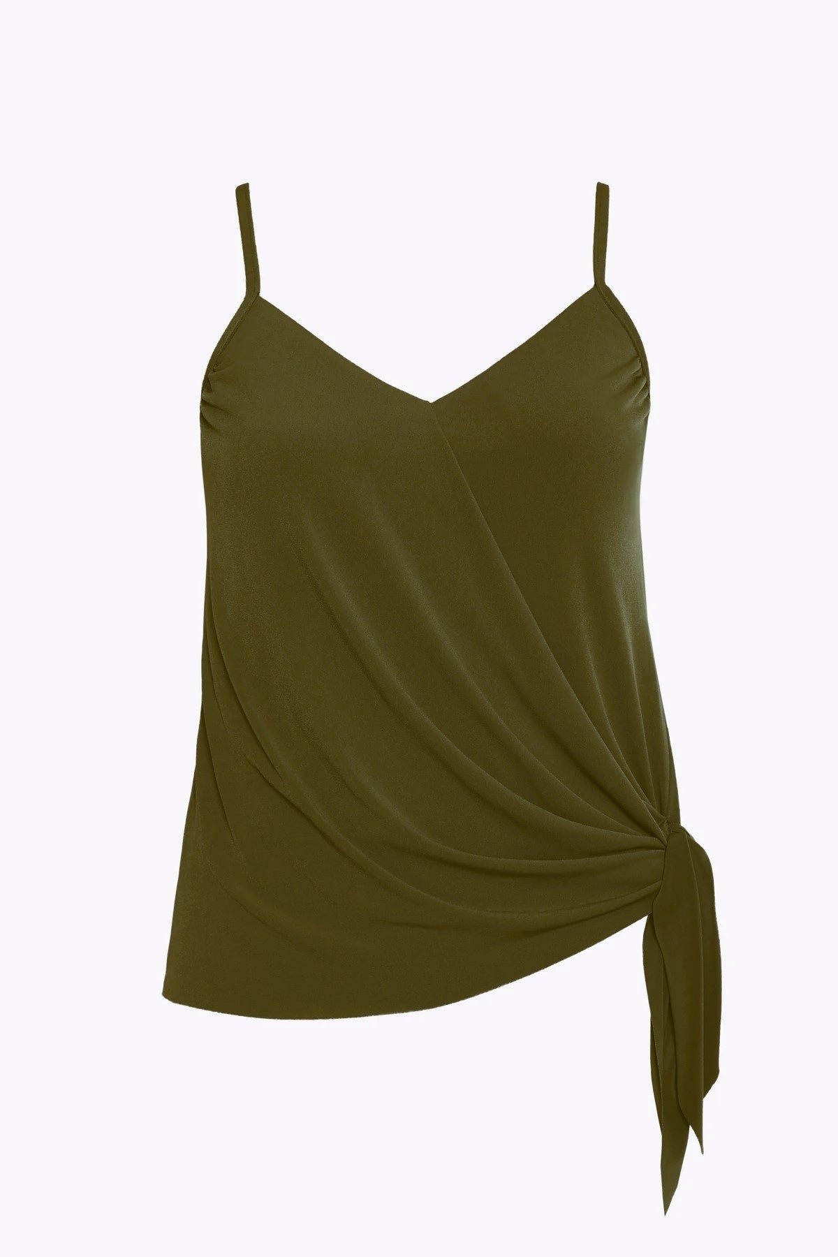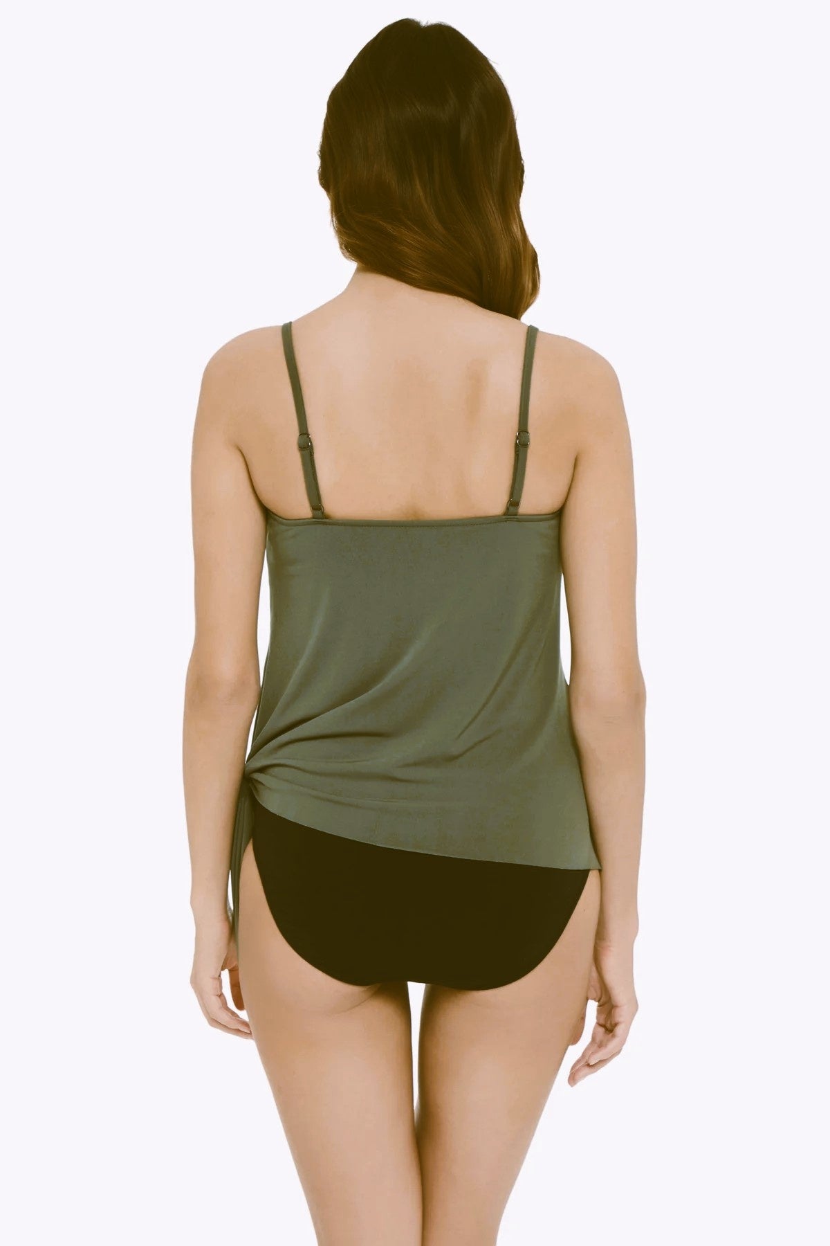 Traje de baño de dos piezas tipo tankini, diseñado con tirantes delgados ajustables y detalle de drapeado lateral con lazo que aporta un toque moderno y favorecedor. La parte superior estilo cruzado ofrece comodidad y un ajuste natural, mientras que la parte inferior brinda cobertura ideal para mayor seguridad y confianza en cada movimiento.